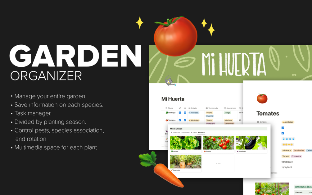 The Garden Organizer in Notion is the perfect tool for gardening lovers 🌿. With this template you’ll be able to register each plant, organize your seeds, plan sowing and harvesting seasons, and discover healthier crop combinations. Plus, you’ll have a dedicated space to store photos, notes, and tips to take your garden to the next level. 🌱✨