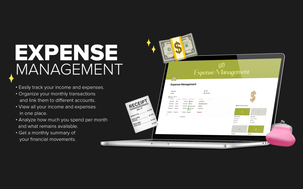 Keep your finances under control with this expense management template in Notion. Ideal if you're looking to organize your monthly transactions in different accounts, allowing you to view all your financial movements in one place.
