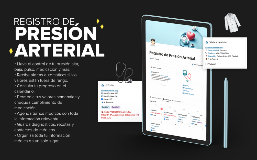 Registra tu presión arterial, pulso, medicación y turnos médicos fácilmente con esta plantilla de Notion. ¡Controla la salud arterial tuya, de tu familiar o de tus pacientes de forma organizada y sin complicaciones! 🩺🗓️